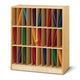 This is a mobile wooden storage unit designed for early childhood classrooms, featuring multiple compartments for organizing books, educational materials, and audio equipment. Features: